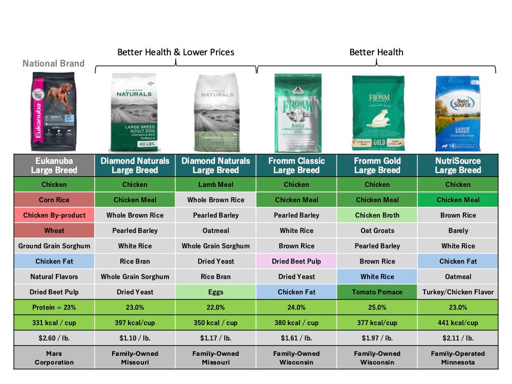 about a $1 less per pound and has a much better ingredient panel and no by-products, corn, soy, or wheat is found in any Fromm pet food.