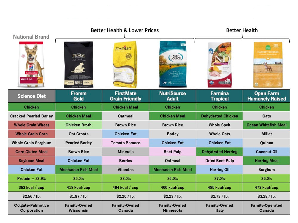 Fromm Gold is a Wisconsin family-owned company that cost 59 cents less per pound and has a much better ingredient panel with a touch more protein. No corn, wheat, or soy.