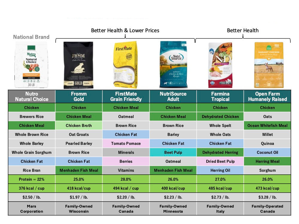 Fromm Gold is a Wisconsin family-owned company that cost 53 cents less per pound and has a similar ingredient panel with 3% more protein.