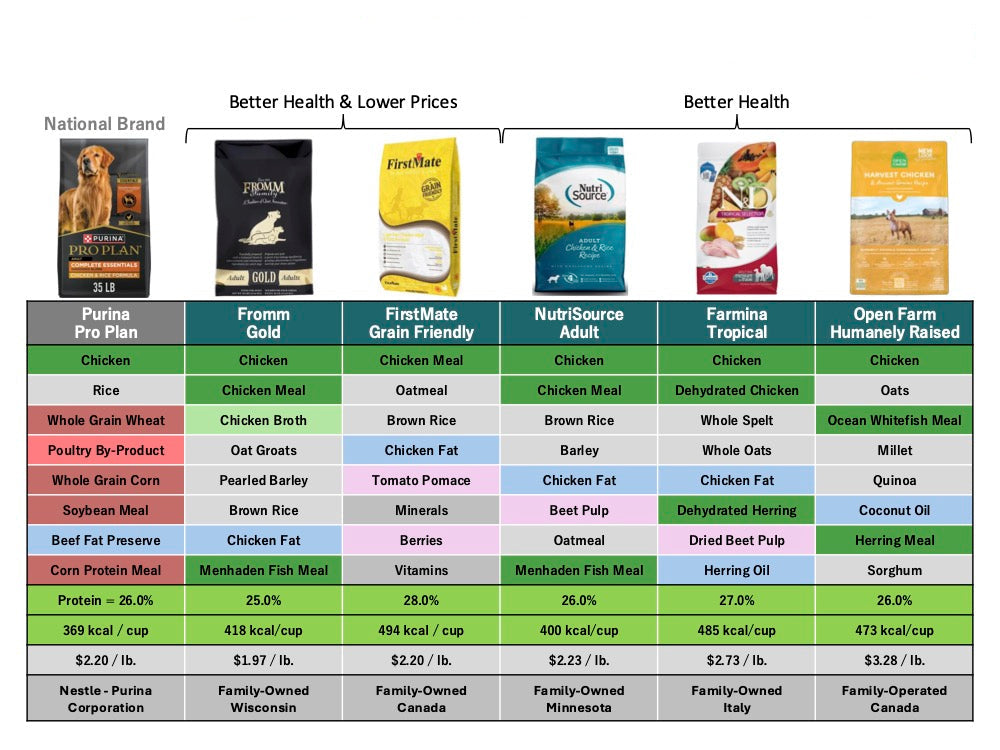 Fromm Gold is a Wisconsin family-owned company that cost 23 cents less per pound and has a much better ingredient panel with a touch more protein from real meat. No corn, wheat, or soy in any Fromm pet foods.