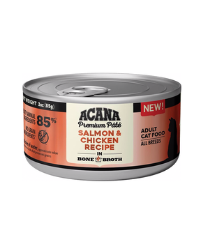 ACANA® recipes are thoughtfully crafted from start to finish with delicious, quality ingredients. ACANA® Premium Pâté Salmon & Chicken Recipe in Bone Broth is specially crafted to nourish your cat with 85%1 premium animal ingredients. Our premium pate also includes savory bone broth that provides the added hydration your cat needs, as well as a burst of delicious flavor in every bite. Rich with quality raw animal ingredients, ACANA Premium Pâté satisfies your cat completely with the animal protein they crave.