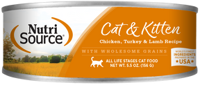 NutriSource® Chicken, Turkey & Lamb Formula Cat and Kitten Food is formulated to meet the nutritional levels established by the AAFCO Cat Food Nutrient Profiles for all stages of a cat’s life.