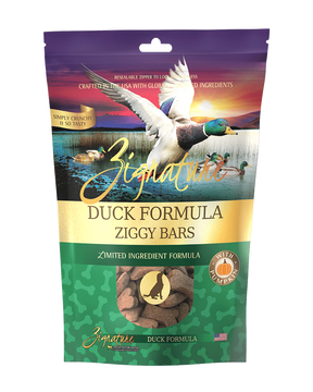Zignature Duck Ziggy Bars make training time more fun! These tasty treats are formulated with the same limited ingredient philosophy as our dry and canned foods and include healthy, wholesome ingredients like pumpkin to make treat time much more enjoyable for you and your furry friend!